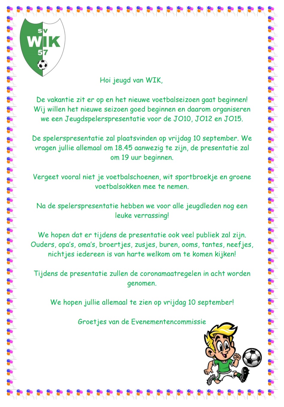 Komende zaterdag komt de jongste jeugd van WIK ook weer in actie. We hebben een leuk teampje van jonge spe(e)l(st)ertjes van de leeftijd van 5,6,7 jaar welke gaat deelnemen in de eilandelijke onderlinge poule. In de poule doen 5 andere vereningingen mee, namelijk DZC'09, MZC'11, Brouwershaven, SKNWK en BDC (Bruse Boys, Duiveland Combinatie). Op dit moment staan er 9 wedstrijden gepland vanaf komende zaterdag tot en met 27 november. Lees meer voor het schema.