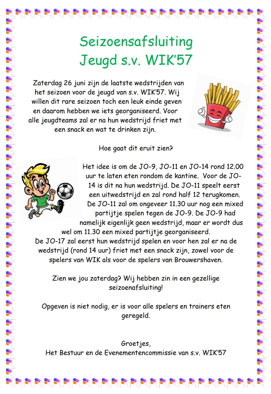 Het seizoen is klaar, dus even geen voetbal op de Vospit. De gemeente gaat onderhoud aan de velden doen, dus mag er ook niet op de velden worden gevoetbald ! Wil je een balletje trappen, dan kan dat natuurlijk wel in de voetbalkooi.